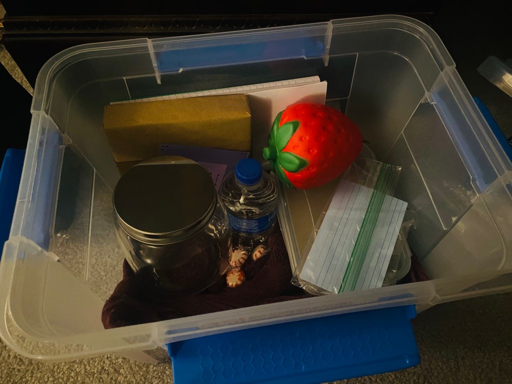 I used a medium-sized plastic bin, and it includes a notebook for free-writing, a defusion jar, a bottle of water, mints, two sensory items (a squishy strawberry and a container of sand), and some notecards with some of my favorite encouraging quotes and song lyrics.
